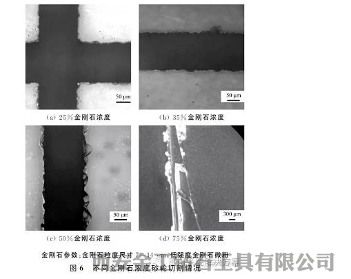 綜合濃度對濾光片切割崩口、切割速度、砂輪壽命的影響,50%金剛石濃度綜合效果最好。
